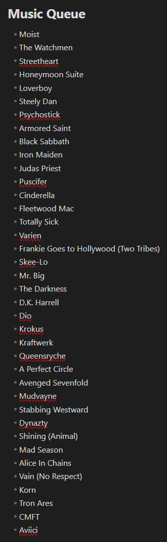 function to name and note it for me) and try the bands out later. Even better, I've found the huge number of amazing "music story" YouTube channels to be a treasure trove of new songs and artists. Todd In the Shadows, David Hartley, Music Mongoose, Tank the Tech and Adjustment Day are just a handful of creators that either tell me about new artists I've never heard of, or reignite my interest in old ones through their retelling of their careers and how they made their music. I actually keep a note in Obsidian where I'll jot down any artists I've been meaning to get to or just listen to again and when I'm unsure what to put on, I'll pick one and just let it roll.