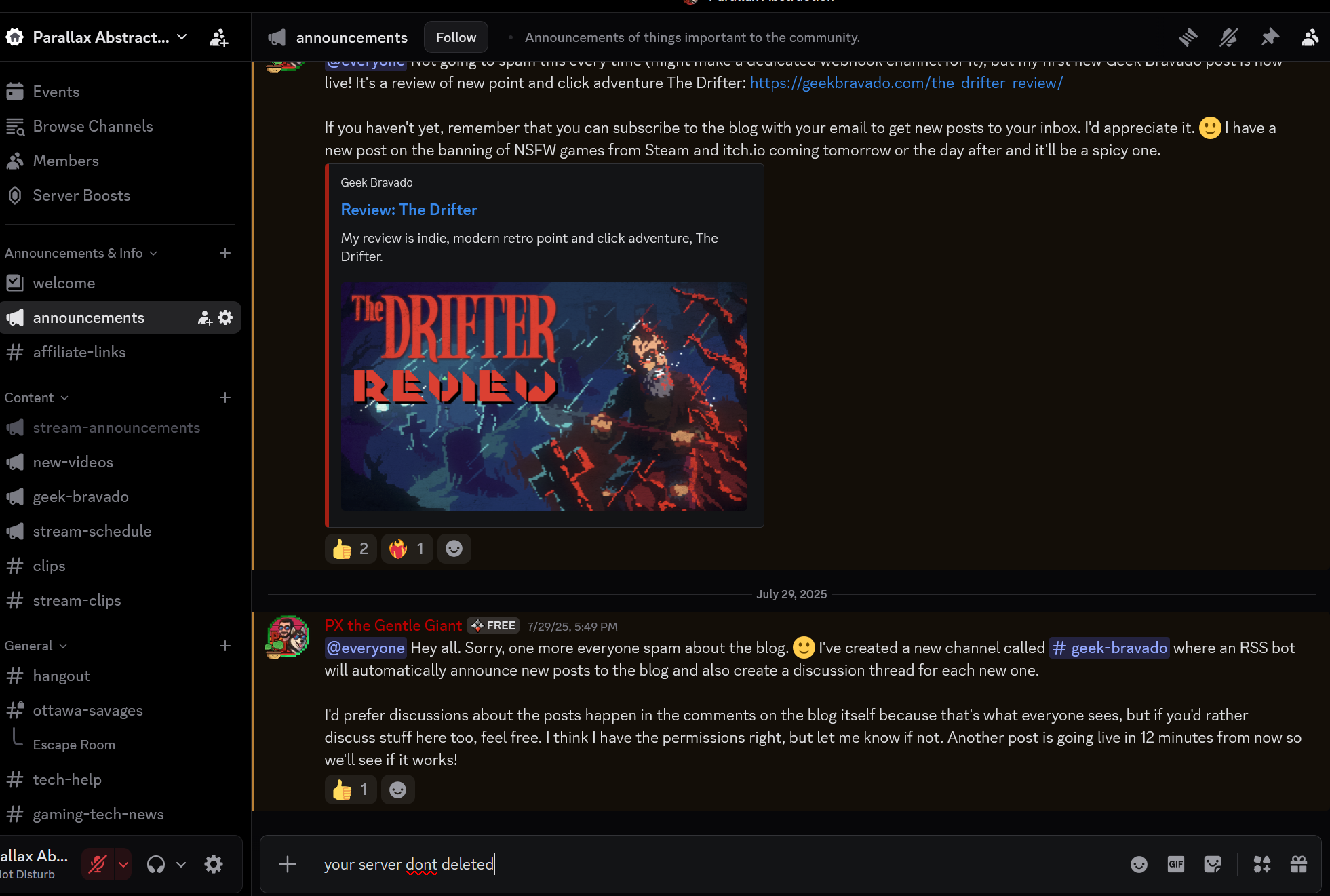 I kept stringing him along but he was starting to get impatient and people I knew who were still in my server said channels were starting to disappear and users were getting randomly banned. He was trying to do the virtual equivalent of sending me severed thumbs in the mail.