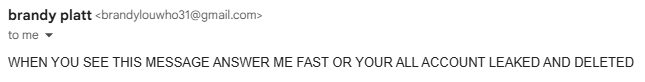 The scumbag sent me an email about an hour later eloquently titled "YOU HACKED". Clearly, I was dealing with a master of English standard here. He said I had to respond to him or he would leak and delete everything.