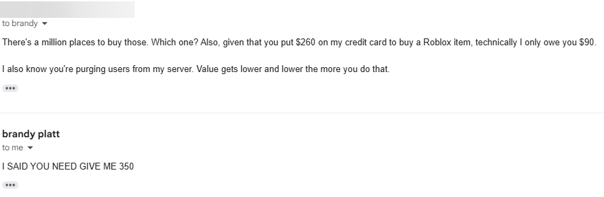 From the support transcript, I had the name of the Roblox account the item was added to. I'm sure the scumbag doesn't play Roblox, he was just loading up an account with stolen high-value items to resell later. I opened a ticket with Roblox to try and have the account banned for illegal activity and they responded the following day acting like I asked a different question entirely. This was also no surprise. Roblox can't even make an effort to deal with the rampant child predators on their platform, what chance did I have that they'd care about this? Oh well, my bank will get me the money back.