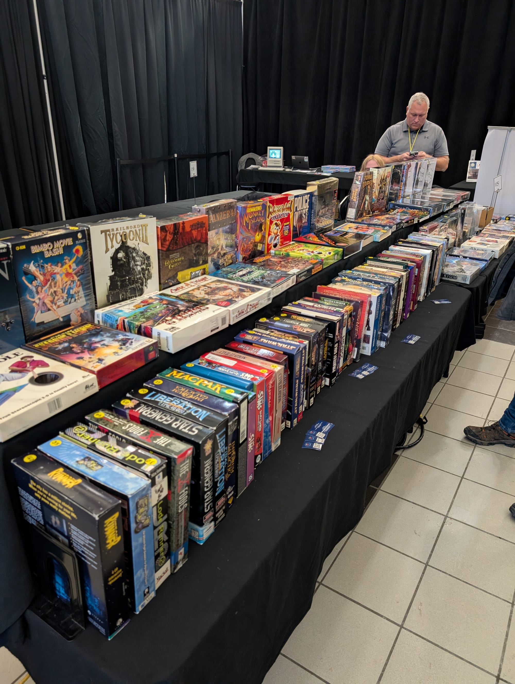 The floort was split up into two rooms, with one exclusively for vendors and the bigger hall for either exhibitions or those doing a mix of both. There was also the traditional VCF consignment and free areas, though both were pretty sparse this time. I did find this set of empty and collapsed Wing Commander II expansion pack boxes in the free section, which I hope to restore and eventually find the innards to complete.