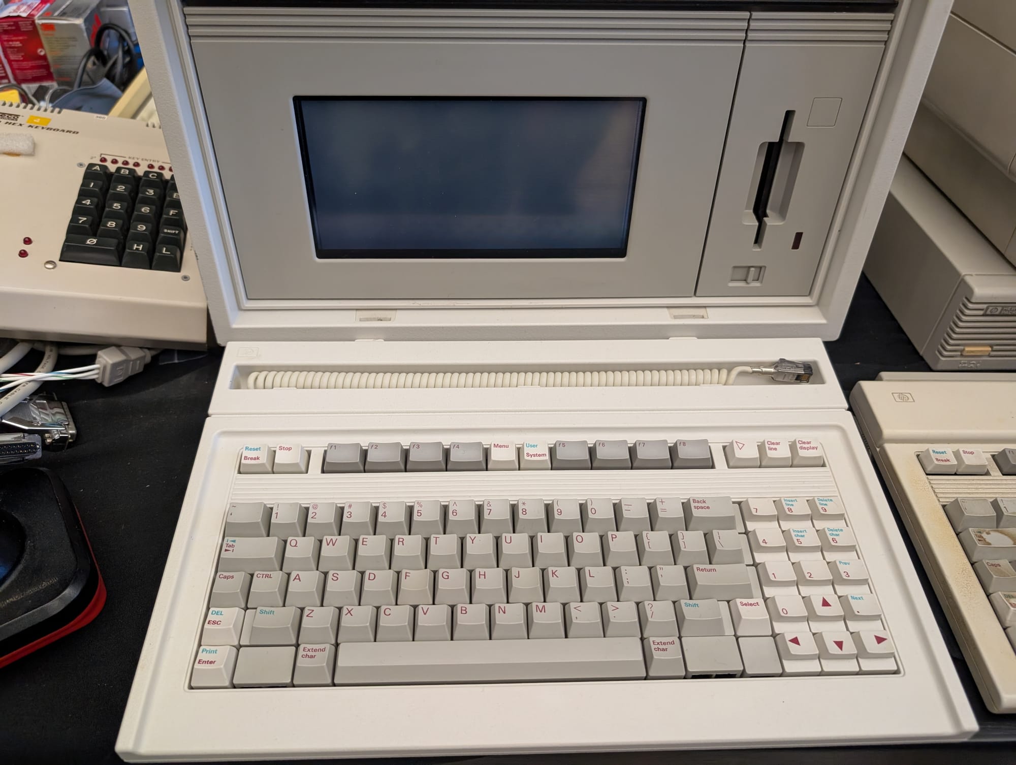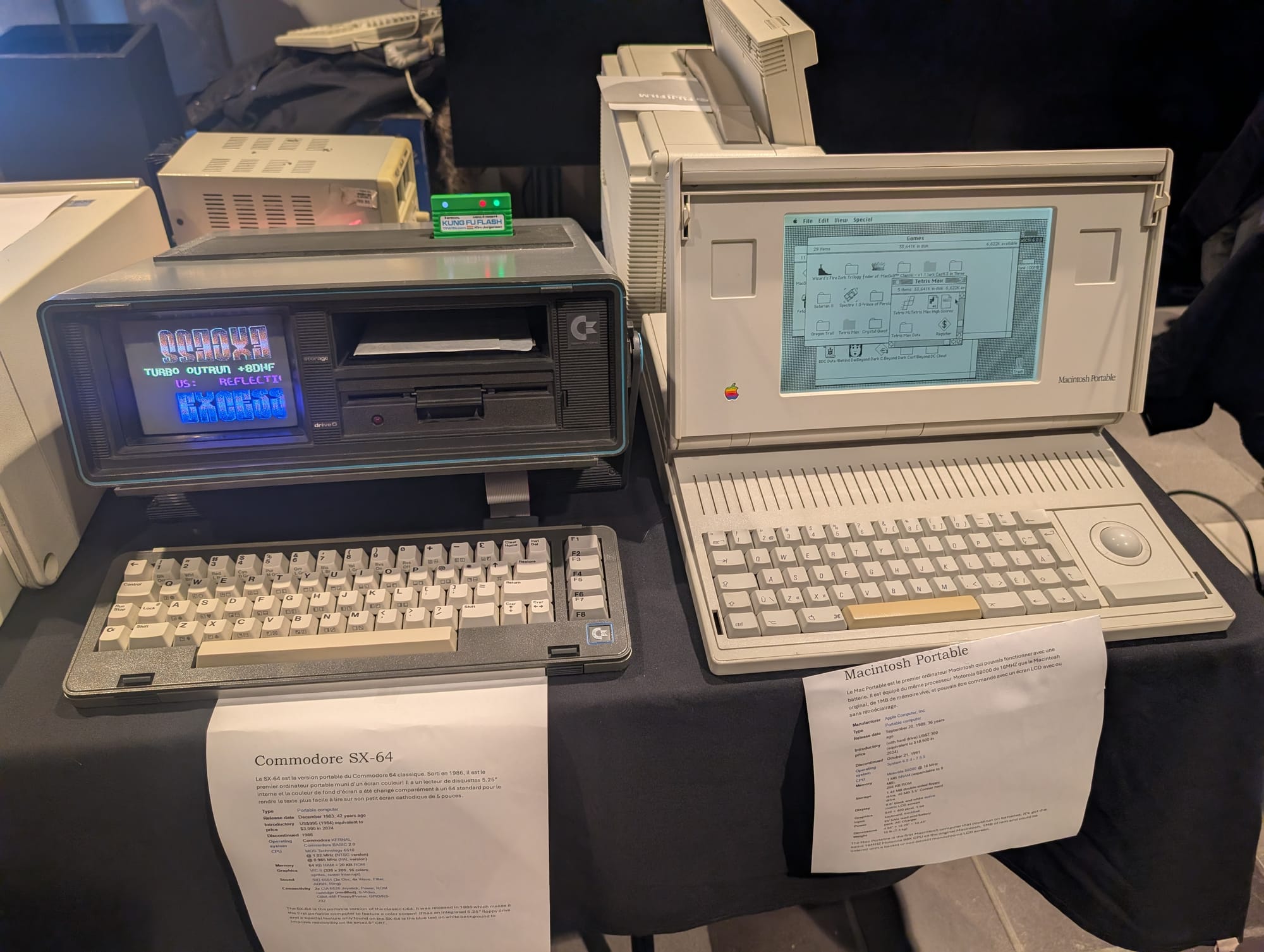 This booth was showing off a selection of "portable" (often called luggable) computers from back in the day. They were chonky, heavy and generally pretty impractical, but those that could put up with all that (and the exorbitant price tags) loved them. The PC I got most of my initial DOS experience on was a Toshiba T3200 that sounded like a jet and also took about as much power as one. I remember playing Alleycat on an orange plasma screen that didn't look all too different from the orange CRT pictured. Some of these were for sale and none interested me, though I would have been tempted by a working T3200 if he had one.