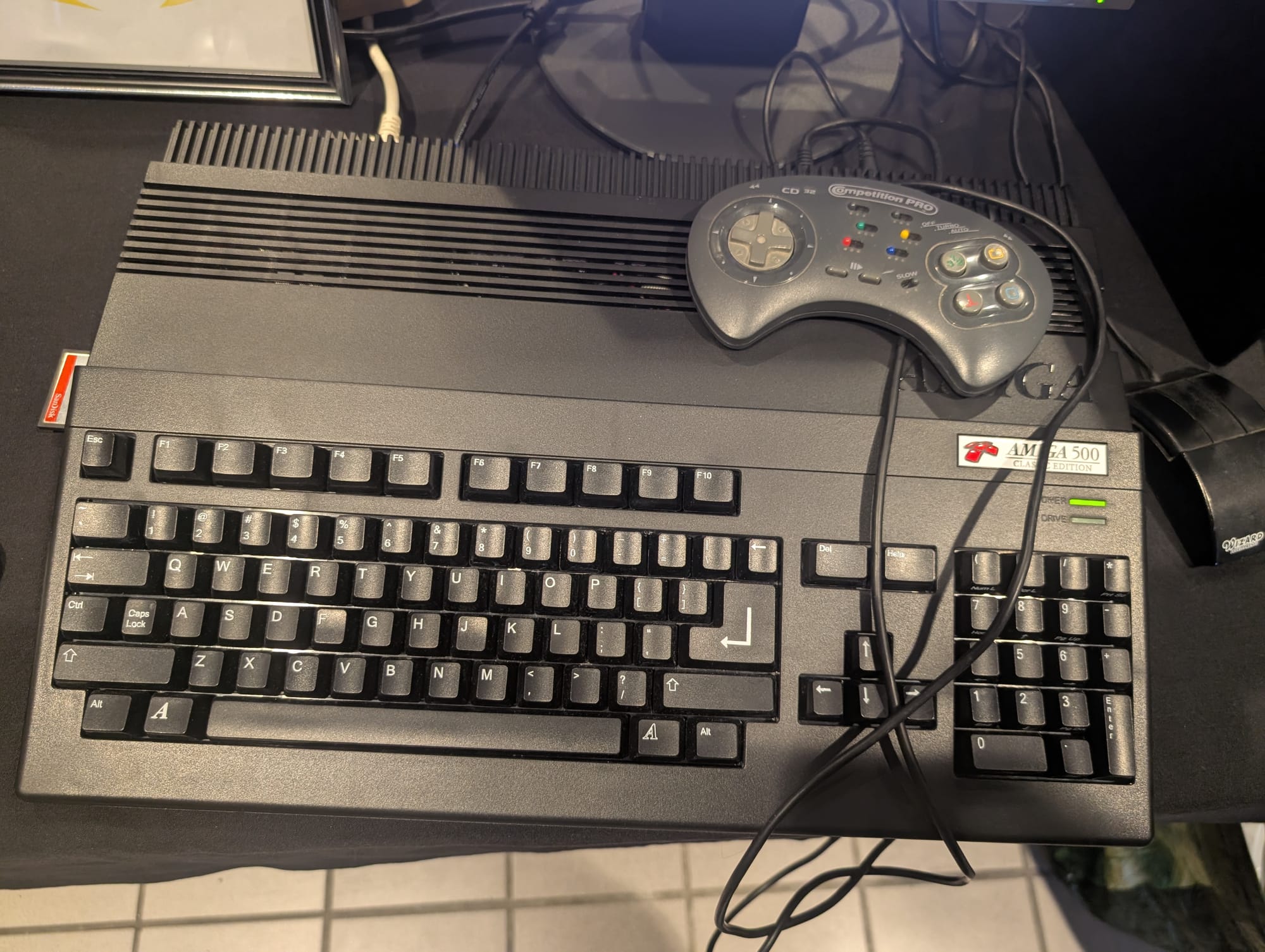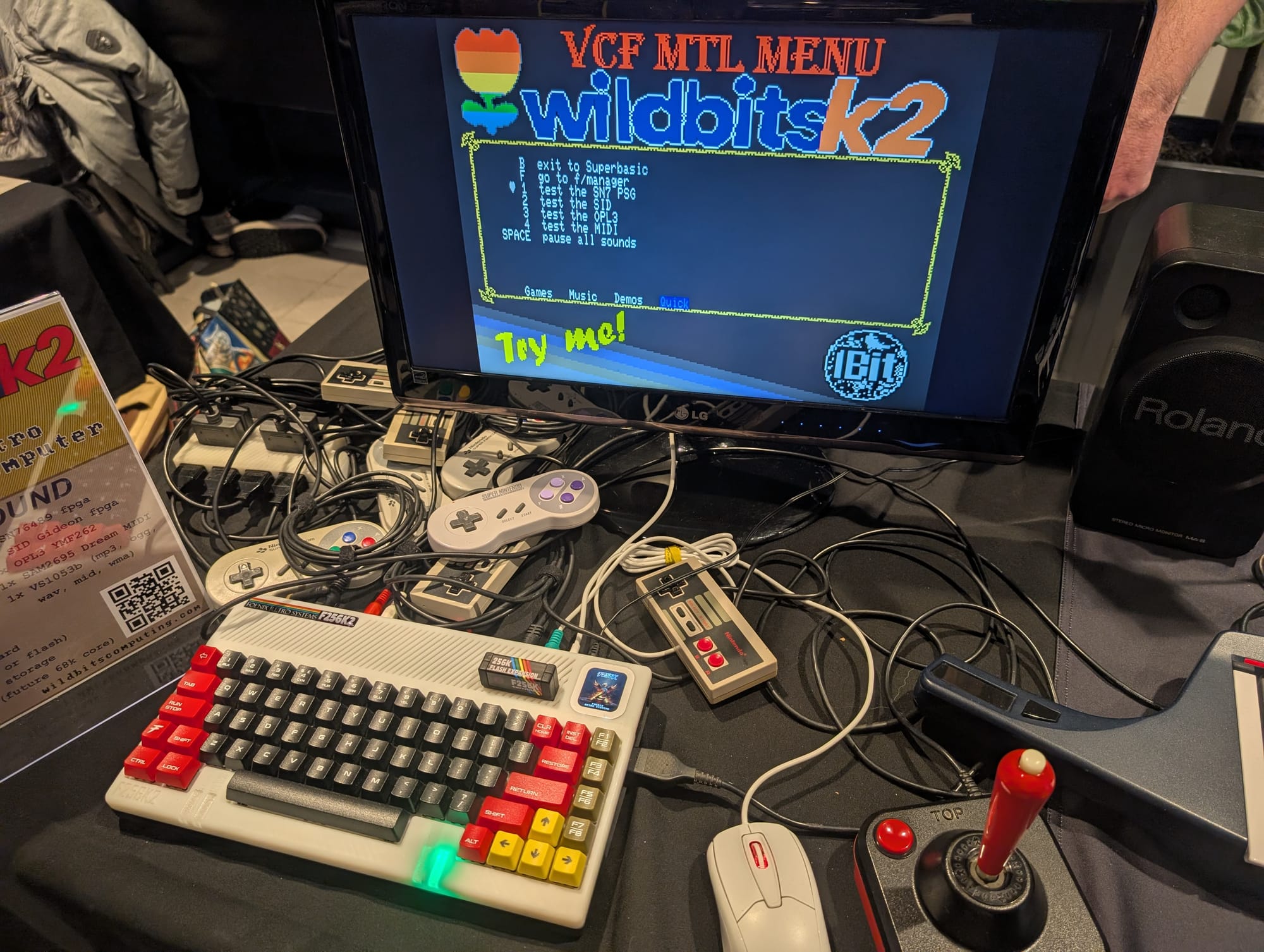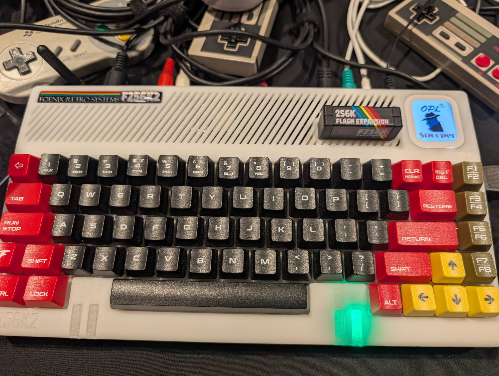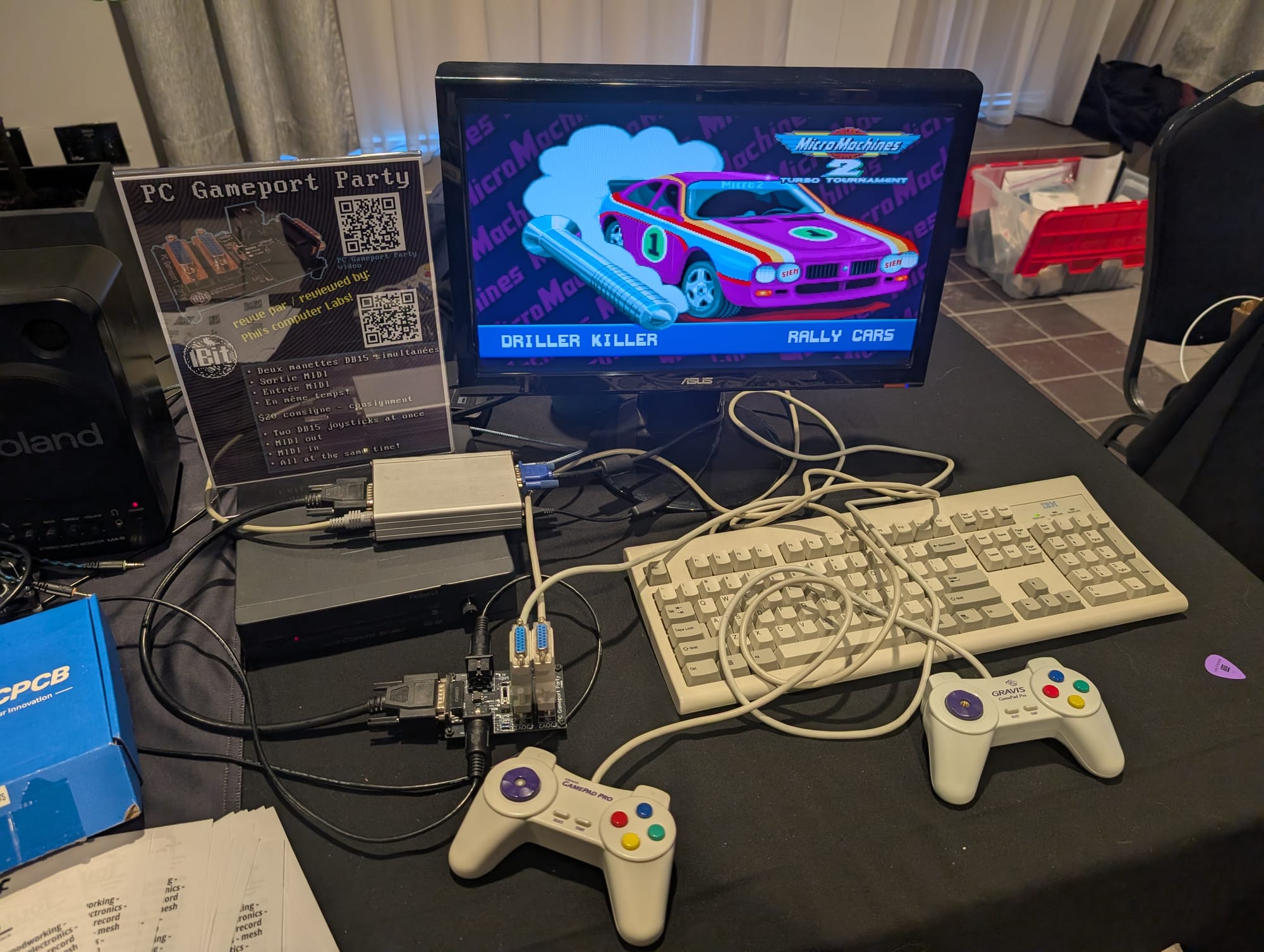 1Bit Fever Dreams is a Canadian retro maker and YouTuber who partakes in a bunch of cool projects. In the second photo is the PC Gameport Party, a simple but great product that takes the normally single game port found on DOS-era PCs and splits it into two, while also providing MIDI passthrough. He was selling a handful of pre-made units for only $20 and I scored one! He was also showing off his Foenix/Wildbits k2 "New Retro Computer", a small batch system developed largely by a single Canadian named Stefany Allaire who I see as basically if you fused the knowledge John Carmack and Jeri Ellsworth into a single nexus of genius. It's not a mainstream product and is designed as a project system but it's stunning what people have done with such a tiny niche device. Foenix Labs is developing a new system now and as much as I'd love one, I wouldn't even know where to begin with it. And yeah, that is absolutely one of the rare Guitar Hero keytar controllers being used as a MIDI keyboard.